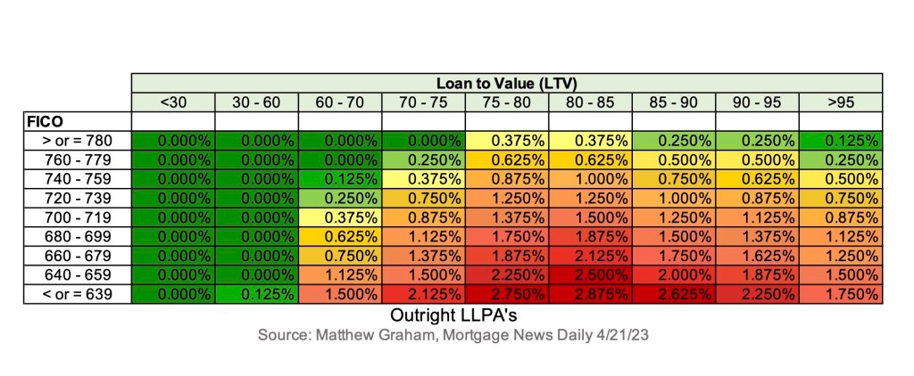 Very, very briefly, I’d like to hit on Loan Level Pricing Adjustments, or LLPA’s. Before we delve into the news, a little definition is important. LLPA’s were implemented in 2008 and are a borrower-specific fee added on top of the base guarantee fee borrowers pay.
