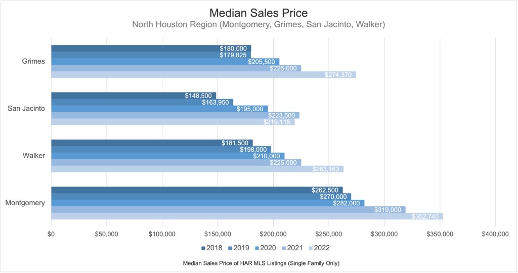 Above, I alluded to increased sales prices. The North Houston housing market remains strong and a safe place to invest funds. Sales price have grown rapidly, with signs of a minor slow-down in appreciation. I would expect to see some stagnation in sales price for 2023, with a return to typical levels (2-4%) in 2024.