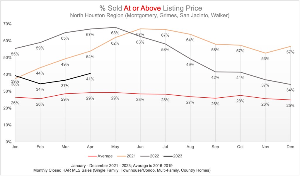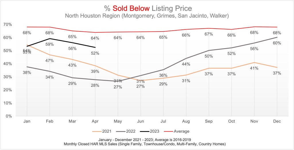 On the flip side, the percentage of homes selling below list price follows the same trend. With 2023 tracking higher than 2021 and 2022 but still below the pre-pandemic average.
